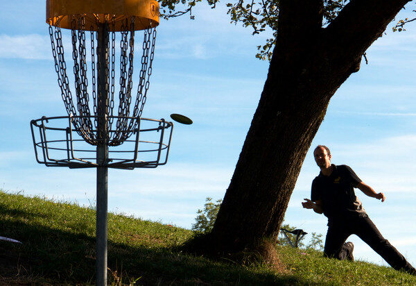 Discgolf ist Golf Spielen mit einer Frisbee-Scheibe -