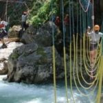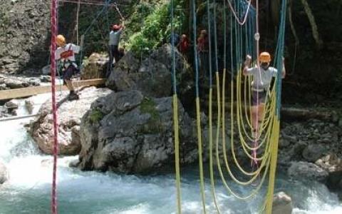 Schlaufenbrücke: Flussüberquerung auf herabhängenden Nylonschleifen.