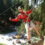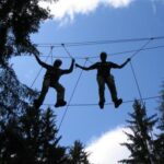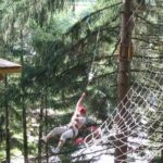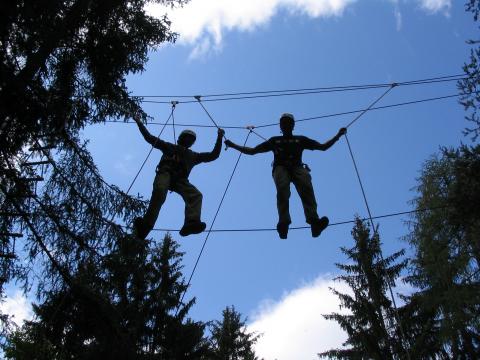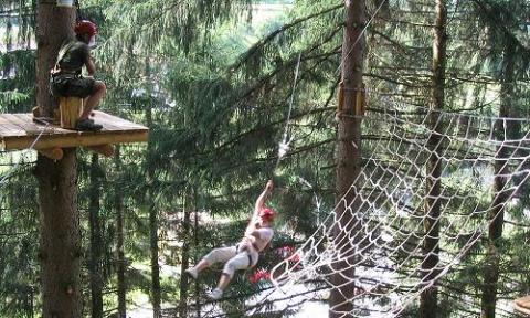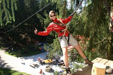 In 18 Metern Höhe genießt man eine andere Perspektive. Dabei kann man sich über eine Leiter hangeln oder beim Netz Swing über eine 12 Meter lange Strecke in ein Netz fliegen.
