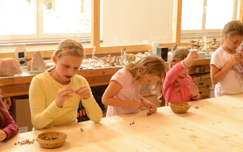 Die Kinder gestalten ihr eigenes Edelsteinbäumchen, kreieren ihr persönliches Schmuckstück oder schnitzen ein eigenes Kunstwerk aus weichem Speckstein.