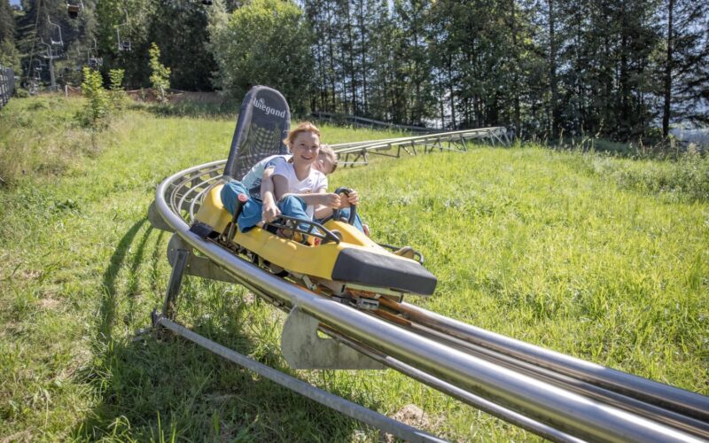 Kreisel, Steilkurven, Jumps, Brücken und Wellen – eine Fahrt mit dem Alpine Coaster ist ein Abenteuer. Schön flott - aber sicher - so geht es im Zwei-Personenschlitten mit bis zu 40km/h den Berg hinunter. Der Alpine Coaster ist bei jedem Wetter zu fahren und verfügt über eine Streckenlänge von 760 Meter.