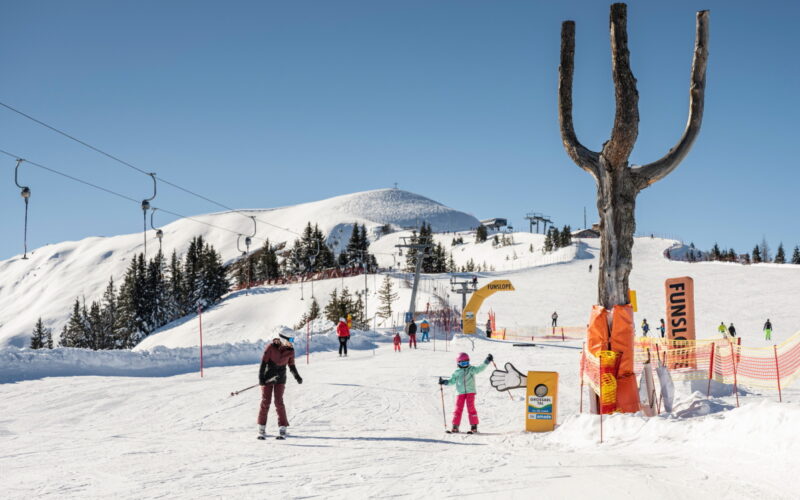 Auf der Funslope wird das Ski fahren für Kinder zum Hit! Hier fährt man nämlich durch Tunnel und über die Wellenbahn. Am Anfang der Funslope klatscht man mit einer orangen Hand ab. High five – dann geht es los über Wellen und durch Tunnel. Bergwärts geht es mit dem Tellerlift, damit die Kinder dann schnell wieder runter sausen können.