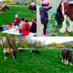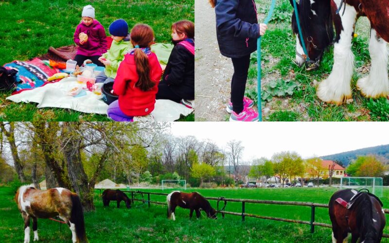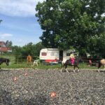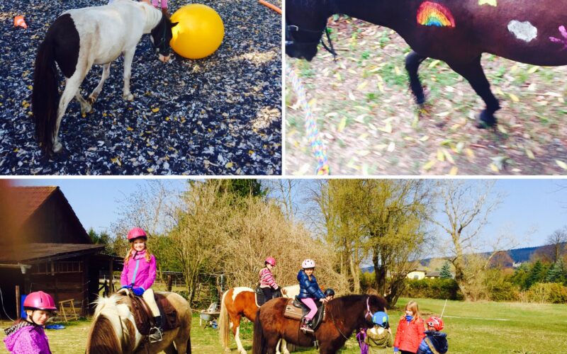 Ponies gemeinsam putzen, schmücken, bemalen und satteln, danach dürfen die Kinder abwechselnd reiten und führen, es werden reitpädagogische Spiele durchgeführt.