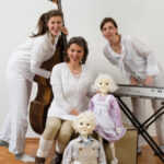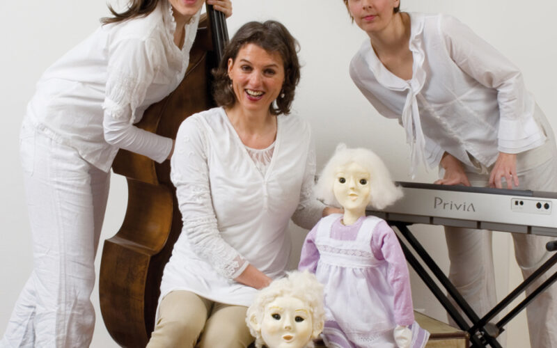 Auf der Bühne sind drei Musikerinnen, ein Kontrabass und ein Klavier … und in der Mitte eine Truhe. Was ist da wohl drin? – Zwei muntere Figurenkinder!