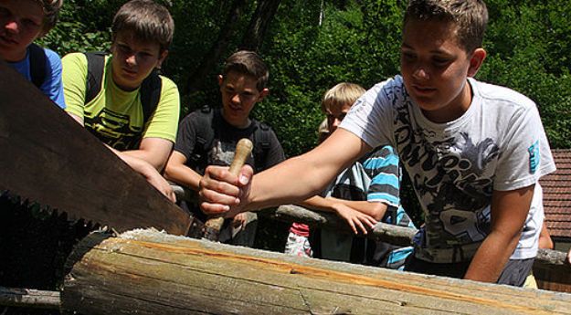 Kennenlernen von traditionellen Arbeiten auf dem Hof, am Feld, im Wald, Ausprobieren div. Tätigkeiten, innerhalb der Klasse treten 2 Gruppen gegeneinander an.