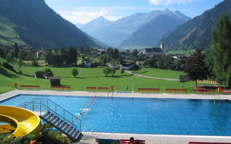 Großzügig angelegte Liegeflächen mit Blick auf das herrliche Bergpanorama und kinderfreundlich gestaltete Becken garantieren den Badespaß für die ganze Familie. Neben Schwimmer- und Nichtschwimmerbecken gibt es einen Planschbereich für Kleinkinder, einen Spielplatz und Beachvolleyballplatz, eine 51m lange Wasserrutsche und Tischtennistisch. Kostenloser Eintritt mit der SalzburgerLand Card und der Nationalpark Sommercard Mobil.