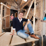 Ein Mann sitzt im Schneidersitz auf einem hölzernen Rezeptionstresen, lächelt und hat die Arme ausgestreckt, vor einem Wandschild mit der Aufschrift „Treffpunkt Baumhaus“.